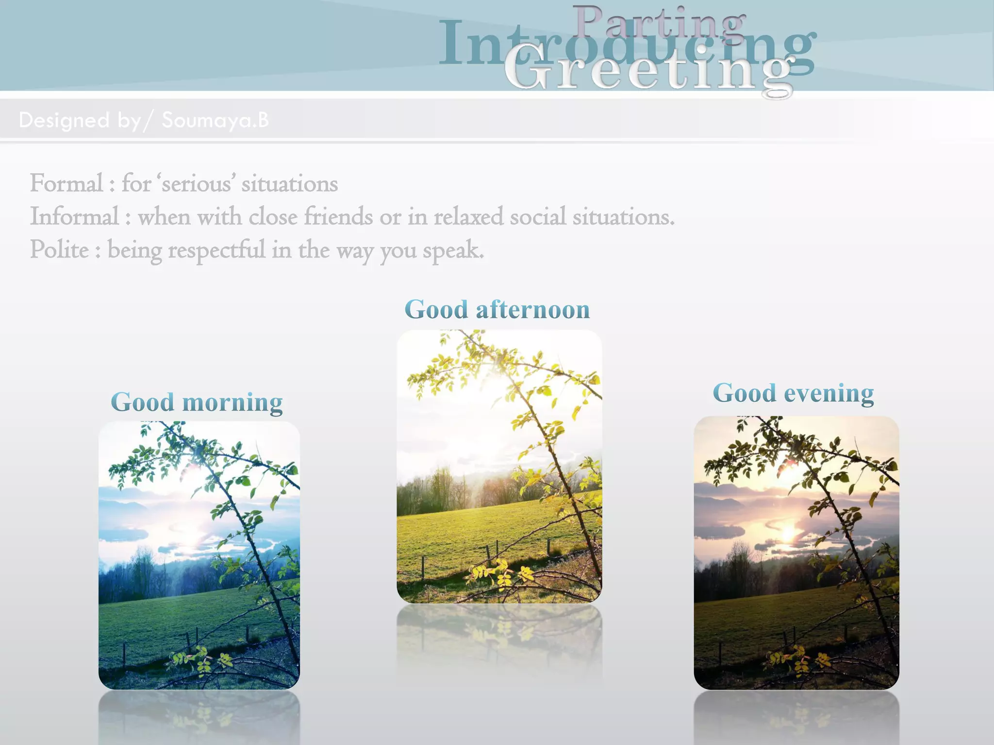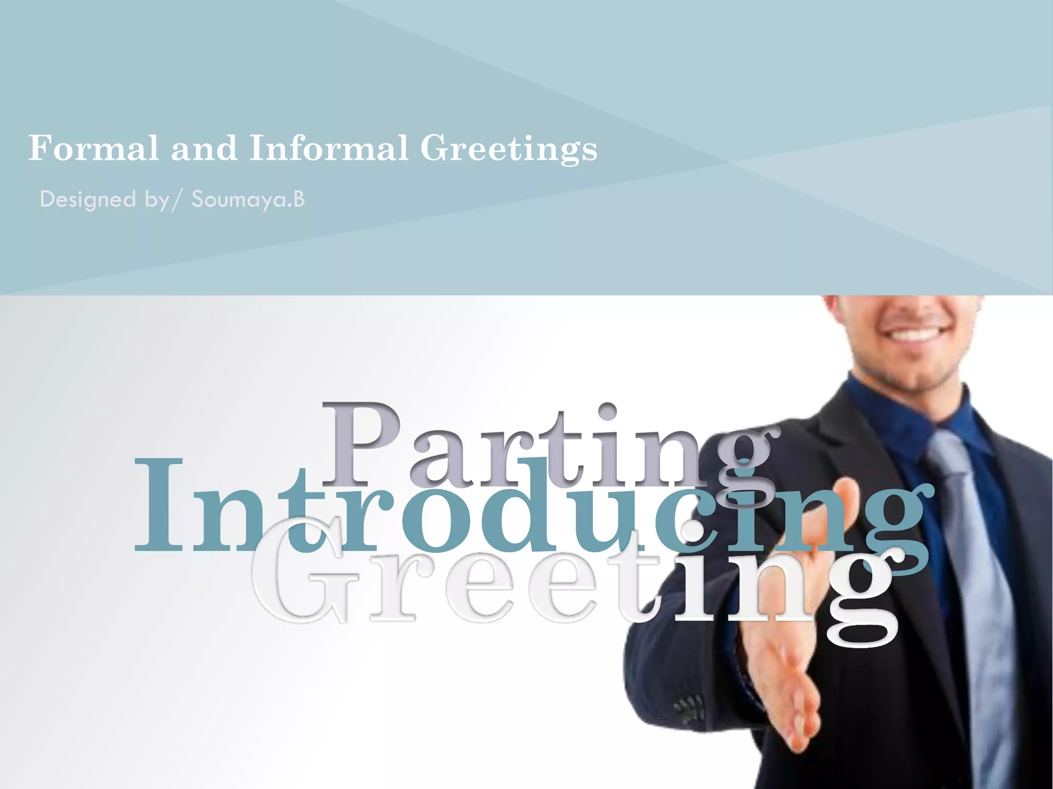 The document discusses formal and informal greetings and introductions. It provides examples of formal greetings like "Good morning Mr. Williams" and informal greetings like "Hi, how are you?". It also demonstrates introducing one person to another formally as "Mr. Jones, may I introduce you to Mr. Williams?" and informally as "Hello, I'm John". Finally, it shows ways to say goodbye both formally like "It was a pleasure meeting you" and informally like "See you later!".