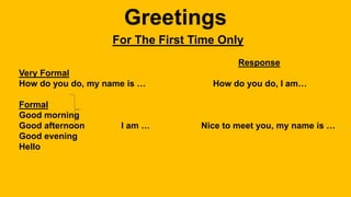 The document provides guidance on greetings and responses for different levels of formality in English. It begins with contact information for Mr. Bill and his English teaching website. It then lists common greetings and responses for very formal, formal, and informal situations. These include "How do you do" and "Nice to meet you" as very formal greetings and "Hi" and "What's up" as informal greetings. Responses range from "I'm fine, thank you" to "Terrible." The document concludes with examples of parting phrases for different levels of formality.