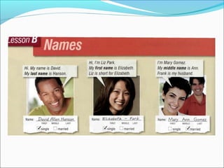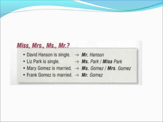 The document outlines common formal and informal greetings, responses, ways to say goodbye, and how to introduce oneself in English. It provides example phrases for greetings, responses, goodbyes, introductions, and suggests practicing a short conversational exchange that incorporates a greeting, introduction with name spelling, and goodbye.