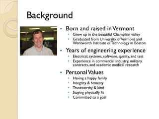 Background  Born and raised in Vermont • Grew up in the beautiful Champlain valley • Graduated from University of Vermont and Wentworth Institute of Technology in Boston  Years of engineering experience • Electrical, systems, software, quality, and test • Experience in commercial industry, military contracts, and academic medical research  Personal Values • Having a happy family • Integrity & honesty • Trustworthy & kind • Staying physically fit • Committed to a goal