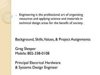Greg Sleeper has over 20 years of experience in electrical engineering, systems design, software, quality, and testing. He has worked on projects in commercial industry, military contracts, and academic medical research. Some of his key skills and experiences include circuit design, PCB design, cable harness design, embedded system development, specification writing, project leadership, and troubleshooting of test equipment. He has successfully led projects in areas such as rounds limit switches, servo systems, aircraft cables, software test plans, and repair of test panels.