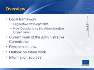 The document summarizes recent developments in EU social security coordination. It discusses legislative developments including a new regulation extending coordination rules to third country nationals and implementing several association agreements. It outlines new decisions by the Administrative Commission regarding applicable legislation, unemployment benefits, and substantial benefits in kind. Finally, it previews upcoming work on the international dimension of coordination, miscellaneous amendments, and linking coordination better to other EU initiatives and policies.