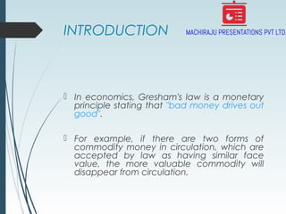 Gresham's law is an economic principle stating that 'bad money drives out good,' meaning that when both good and bad forms of money circulate together, the more valuable good money tends to be hoarded while bad money is spent. This phenomenon occurs because individuals prefer to use the less valuable coins for transactions, retaining the more valuable ones for themselves. The law also has implications beyond currency, applied metaphorically to markets or cultural evolution where lower quality options can dominate over higher quality ones.