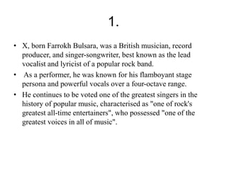 1) It discusses the British musician Freddie Mercury, lead singer of the rock band Queen, known for his powerful vocals and flamboyant stage persona.