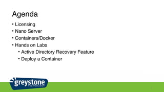 The document outlines the agenda for Windows Server 2016, covering licensing, Nano Server, Docker containers, and various features like Active Directory recovery. It discusses the differences between server editions, resource management strategies, and the advantages of using containers for application deployment. Key topics include server core functionality, deployment options, and the benefits of utilizing Nano Server for streamlined operations.