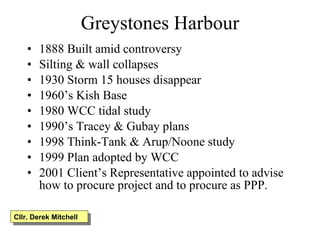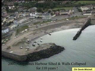The document discusses the history of Greystones Harbour from its construction in 1888 to plans for its redevelopment in 2014. It details periods of silting and wall collapses at the harbour over 110 years. Redevelopment plans from the 1990s onwards are outlined which aim to transform the harbour into a focal public space for the expanding town with facilities for water sports and recreation. Updates on construction progress from 2008 to 2010 are provided.