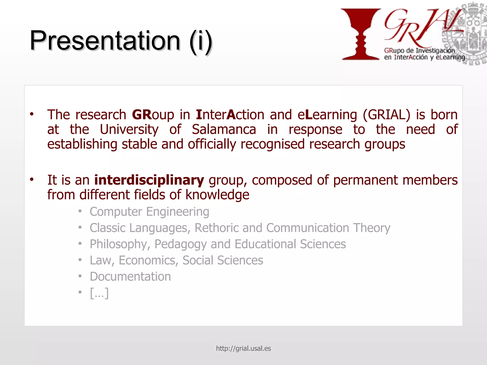 The GRIAL research group was established at the University of Salamanca to conduct interdisciplinary research in fields related to human-computer interaction and e-learning. The group has numerous national and international research projects, teaches various university courses, and provides consulting services related to e-learning/technology solutions. Current projects include the MIH project to develop multilingual teaching tools on history and geography, and the ELVIN project to create an online social network for language learning in public administration.