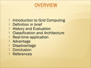 The document provides an overview of grid computing, defining it as a collection of computer resources integrated to achieve common goals without centralized control. It discusses the architecture and middleware necessary for grid functionality, as well as its advantages, disadvantages, evolution, and various applications. Grid computing enables resource sharing across diverse systems and promotes efficiency in computing, particularly for large-scale problems.