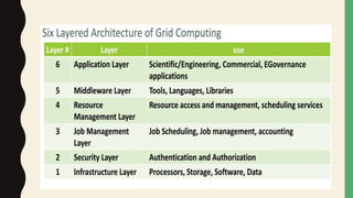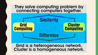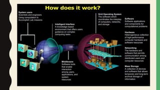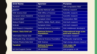 Grid computing is a distributed computing approach that allows users to access networked computer systems and resources located across different areas. It provides computing resources like processors, storage, and applications to users regardless of where those resources are located, similar to how the electrical power grid provides electricity to users without knowledge of its source. Key benefits of grid computing include solving large-scale problems through parallel processing and optimally utilizing idle computing resources. Security, licensing, and performance monitoring present challenges to grid computing's adoption.