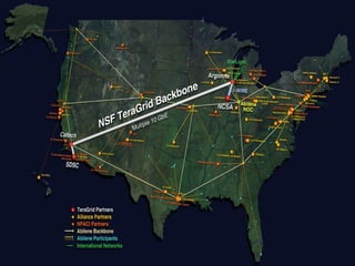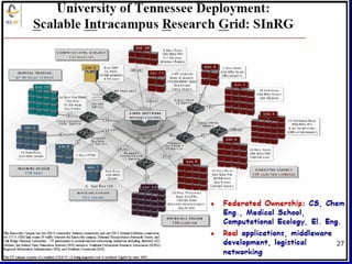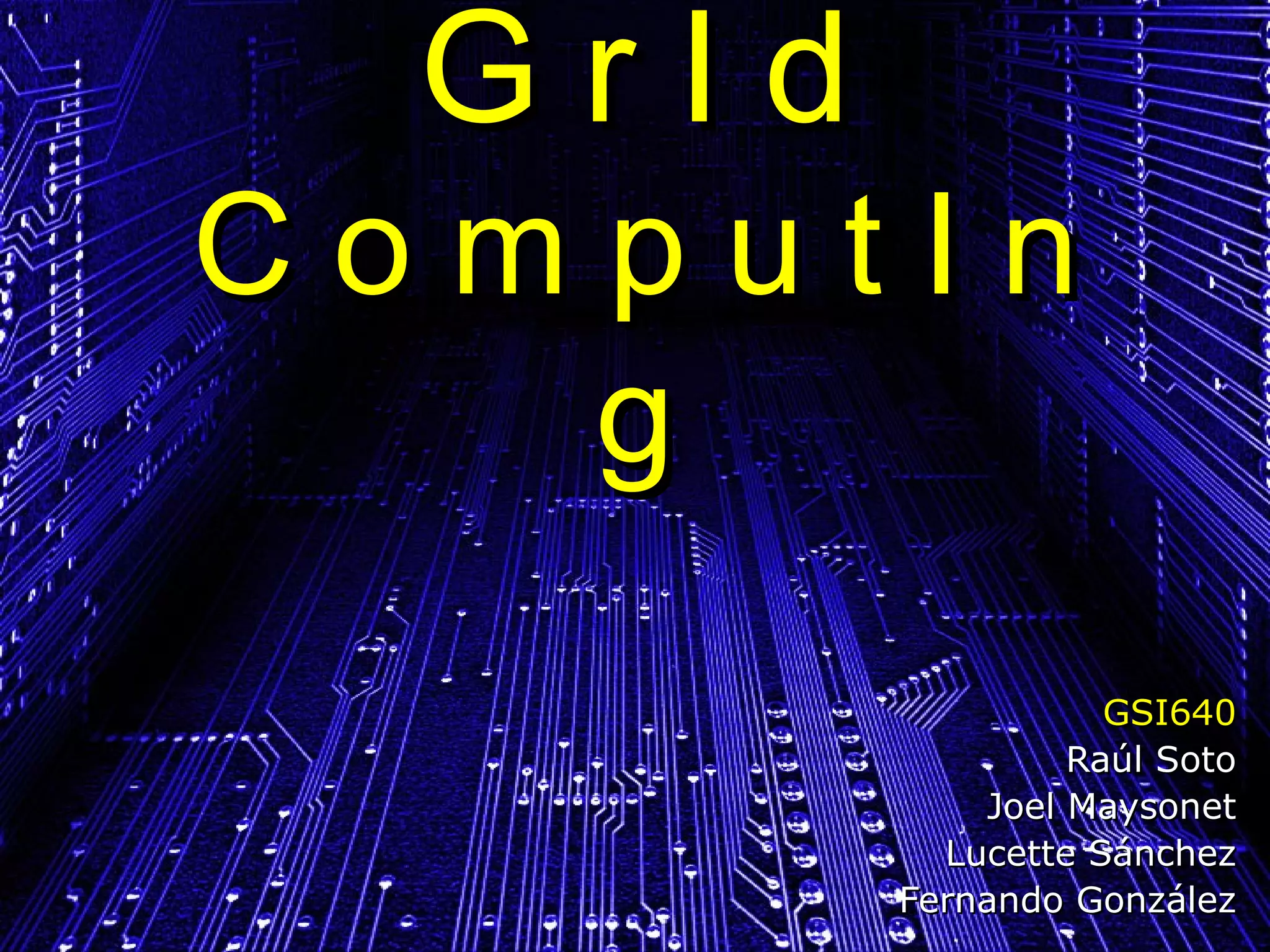 Grid computing allows for the sharing and aggregation of distributed computing resources like computers, networks, databases and instruments. It provides a large virtual computing system for end users and applications. Key characteristics include facilitating solutions to large, complex problems across locations and organizations through integrated and collaborative use of heterogeneous resources. Popular applications include medical research, astronomy, climate modeling and more. Examples of operational grids discussed are TeraGrid, Pauá Grid Project and academic research projects like SETI@home.