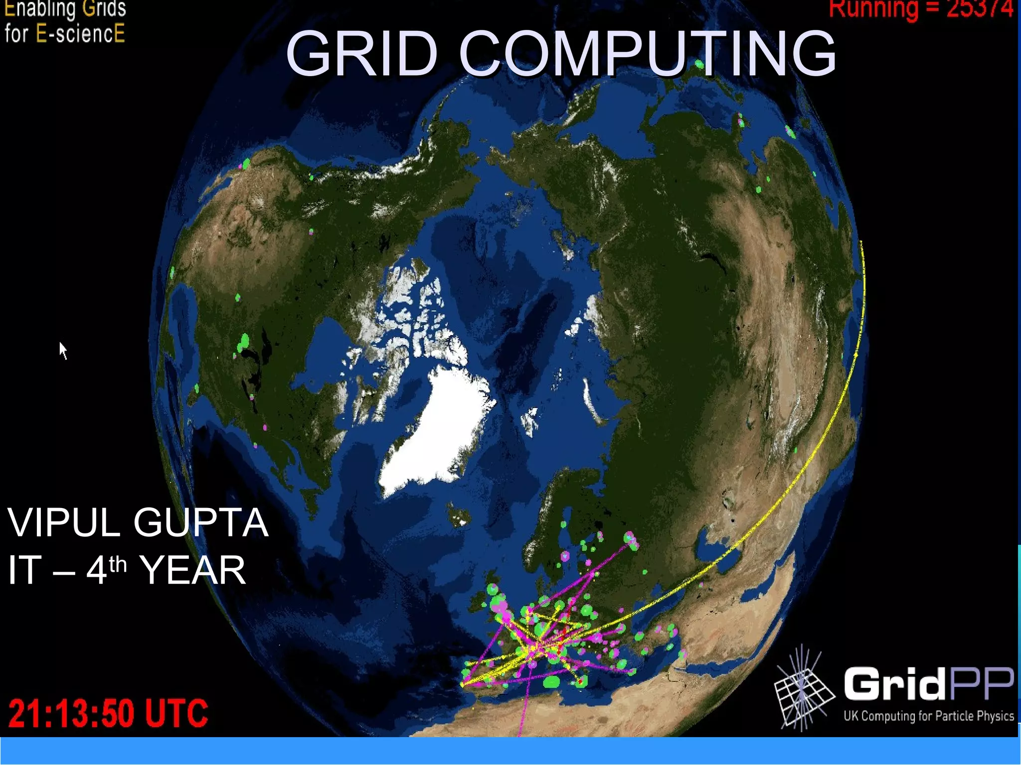 Grid computing involves connecting geographically distributed computers and resources into a single network to create a virtual supercomputer. Resources may include computers, storage devices, instruments, and data owned by diverse organizations. Users can access these heterogeneous resources through a single account, similar to how an electrical power grid provides power from different sources. Key aspects of grid computing include distributed supercomputing, high-throughput computing, on-demand computing, and data-intensive computing. Major companies involved in developing grid computing include IBM, Intel, and Sun Microsystems. Limitations include the need for standardization and use of command line interfaces or programming.