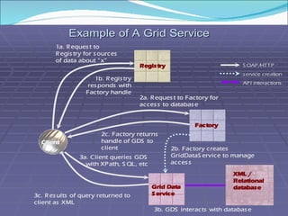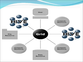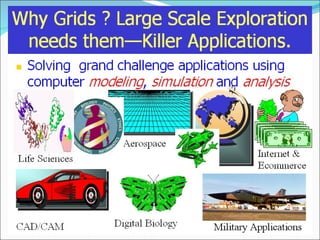 Grid computing involves linking together distributed computer resources from multiple administrative domains to achieve a common goal. Resources in a grid are heterogeneous and geographically dispersed. A grid differs from a cluster in that it provides a consistent, dependable, and transparent collection of computing resources across wide distances. Grid infrastructure must respect local autonomy, handle heterogeneous hardware, and be resilient and dynamic.