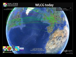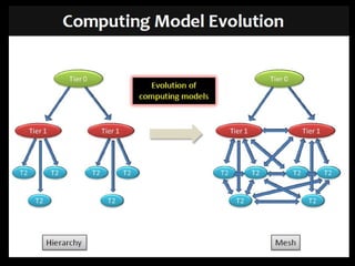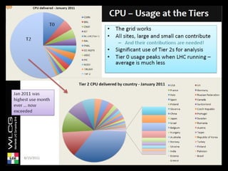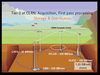 Grid computing involves distributing computing resources across a network to tackle large problems. The Worldwide LHC Computing Grid (WLCG) was established to support the Large Hadron Collider (LHC) experiment, which produces around 15 petabytes of data annually. The WLCG uses a four-tiered model, with raw data stored at Tier-0 (CERN), copies distributed to Tier-1 data centers, computational resources provided by Tier-2 centers, and Tier-3 facilities providing additional analysis capabilities. This distributed model has proven effective in supporting the first year of LHC data collection and analysis through globally shared computing resources.
