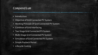 This document provides an overview of grid connected photovoltaic (PV) systems. It discusses the objective of grid-connected PV systems which is to feed excess power generated by the PV system directly into the grid. The basic components of a grid connected PV system are described including the PV array, inverter, transformer, load, meters and protective devices. The working principle and conditions for grid interfacing are explained. Two-stage and multi-stage grid connected PV system configurations are presented. Simulation of PV systems connected to the grid, simple payback period calculations, and lifecycle costing analysis methods are also summarized.