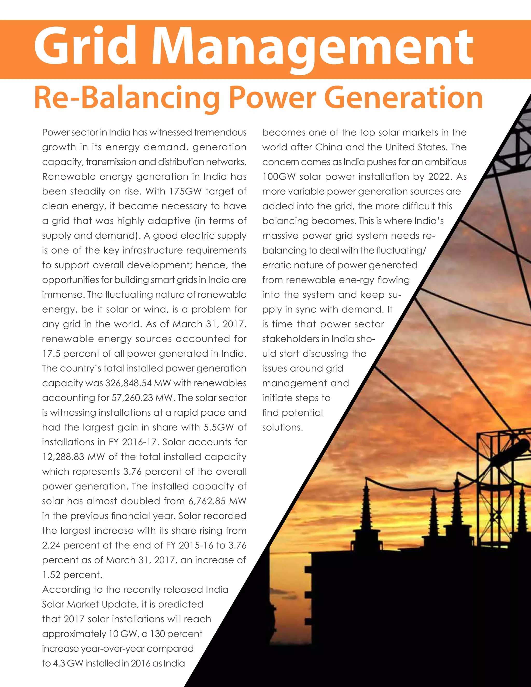 India's power sector is experiencing rapid growth in energy demand and renewable energy generation, necessitating a highly adaptive grid system to balance supply and demand. The integration of renewable sources, particularly solar power, poses challenges due to their intermittent nature, requiring stakeholders to address grid management issues and explore innovative solutions. Strategies such as policy alignment, enhanced forecasting, and the development of smart grids are crucial for supporting India's ambitious renewable energy targets.