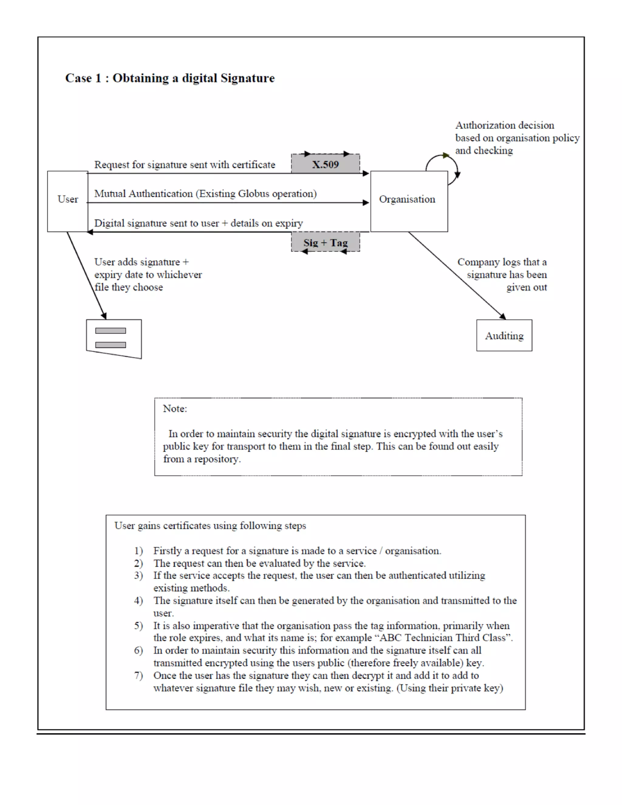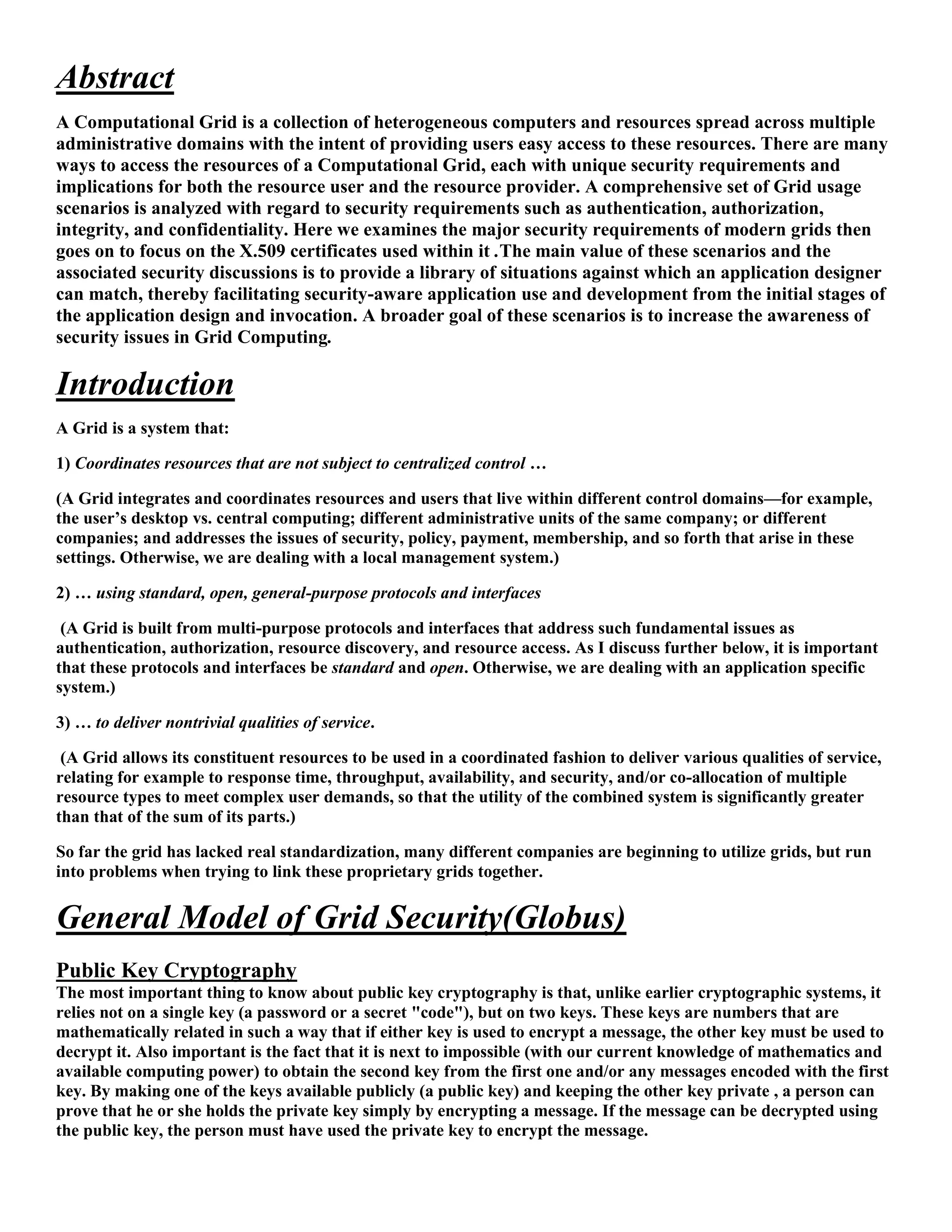 1) The document discusses security requirements for computational grids, including authentication, authorization, integrity and confidentiality. It focuses on the use of X.509 certificates.