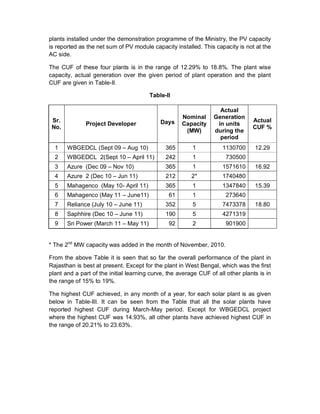 Six grid-connected solar PV power plants have been commissioned in India under a demonstration program announced in 2008. The plants range in size from 1-5 MW and use different PV technologies. Four of the plants have been operating for over a year. Their capacity utilization factors range from 12.29% to 18.8%, with the highest being the 5 MW plant in Rajasthan. In general, plant performance has been best from March to May, with capacity utilization factors as high as 23.63%. The lowest performance months tended to be the first few months after commissioning. Detailed monthly generation data is provided for each plant in Tables V through X.