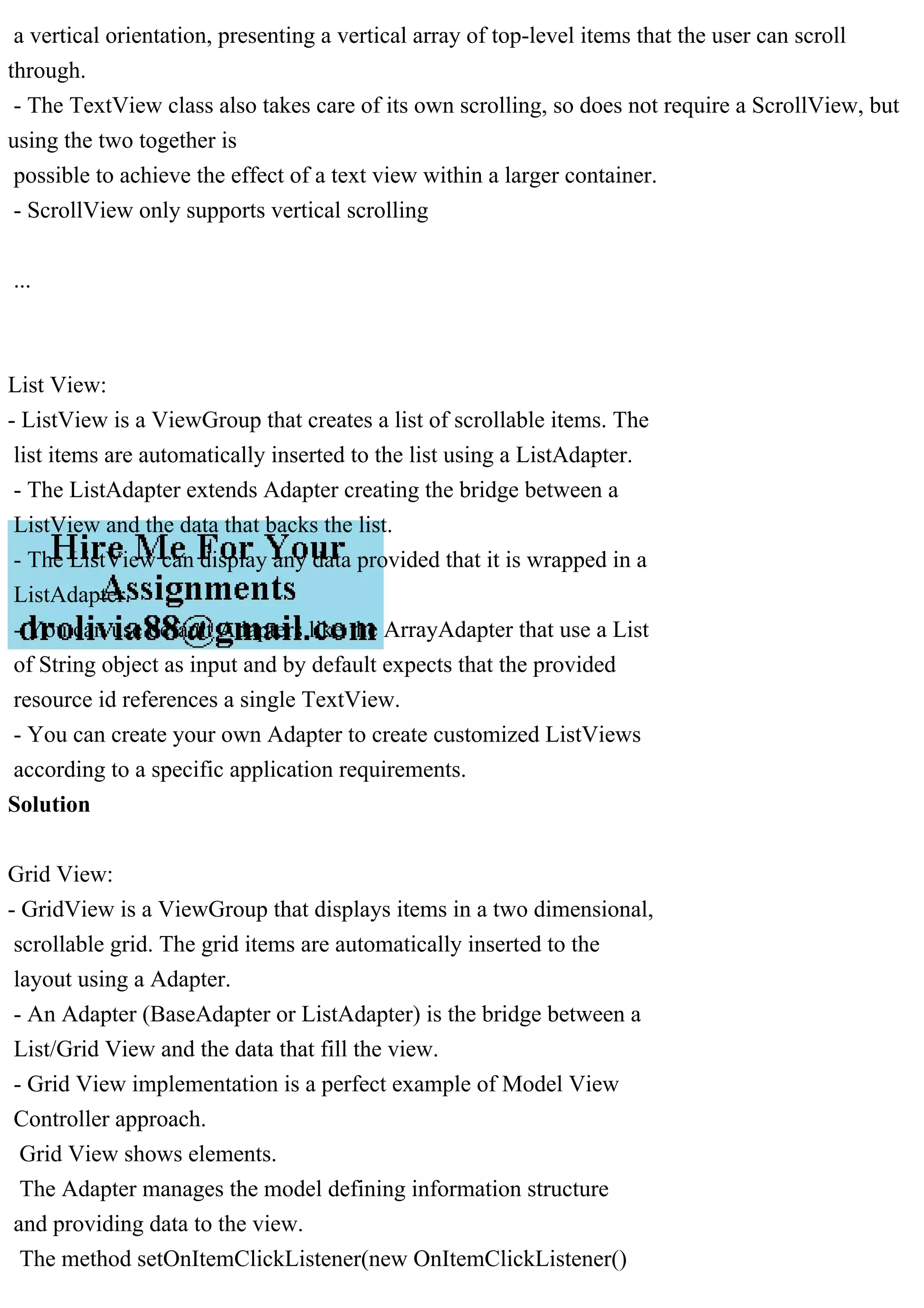 GridView displays items in a two-dimensional scrollable grid with items added using an Adapter. The Adapter manages the data model and provides data to the view. GridView follows the MVC pattern. ScrollView allows scrolling of a view hierarchy larger than the display. It contains one child view that can itself be a complex layout. ScrollView only supports vertical scrolling. ListView creates a scrollable list of items added using a ListAdapter, which extends Adapter to connect the ListView to its backing data. ListViews can display any data wrapped in a ListAdapter.