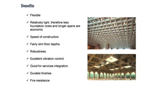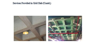 The document provides a comprehensive overview of grid slabs, detailing their definition, applications, and various types, such as waffle slabs, which offer enhanced structural stability. It discusses construction techniques, including prefabrication, and highlights the benefits of using grid slabs in large span projects while minimizing material use. Additionally, it outlines design modifications for utility services and showcases notable structures employing this technology.