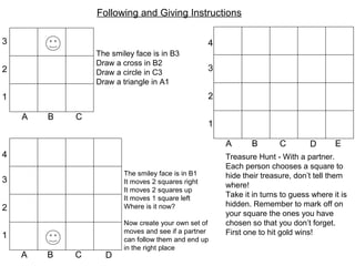 2) It then describes a game where players take turns guessing the location of a hidden treasure on a grid by process of elimination.