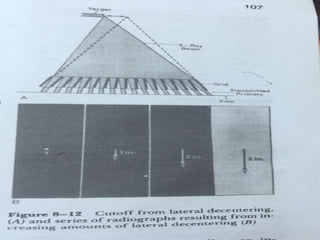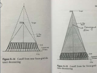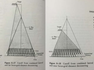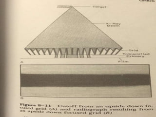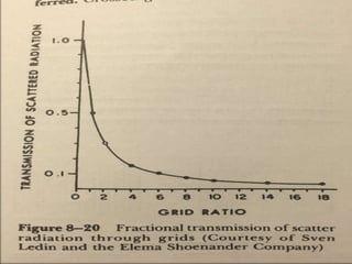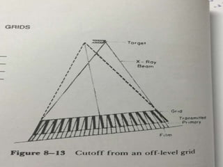 The document summarizes key aspects of radiographic grids used to reduce scatter radiation in x-ray imaging. It describes the components and invention of grids, different grid patterns like linear and focused grids, as well as factors that affect grid performance such as grid ratio and lines per inch. Methods for evaluating grids like primary transmission, Bucky factor and contrast improvement are also outlined. Potential issues with grid use involving cutoff and decentering are discussed.