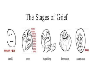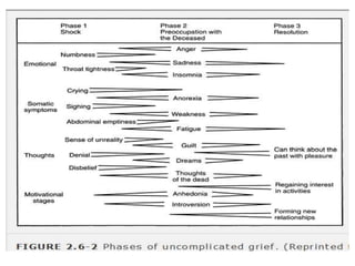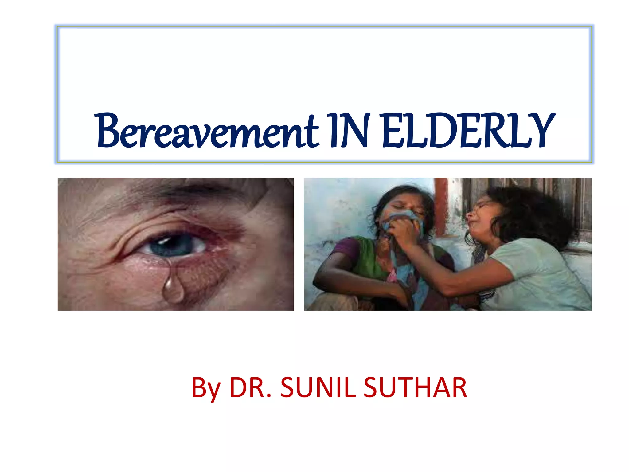 This document provides an overview of bereavement in elderly individuals. It discusses definitions of grief, mourning, and bereavement. It describes the phenomenology and phases of grief as well as types of grief such as anticipatory grief, anniversary reactions, chronic grief, and traumatic bereavement. It examines how age impacts the grief process in older adults and some complications that can arise from bereavement including medical illnesses, psychiatric issues, and persistent complex bereavement disorder. The document also discusses neurobiological factors involved in the grief response.