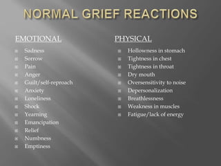 This document discusses common emotional, physical, cognitive, and behavioral responses to grief and loss. It outlines the five stages of grief: denial, anger, bargaining, depression, and acceptance. It then lists different types of losses and endings people experience that can cause grief, such as death, divorce, job loss, etc. The document provides tips for coping with anniversaries and holidays after losing a loved one, including anticipating fears, preparing how to cope, taking care of physical health, and attending to emotional well-being through stress management, relaxation, talking to others, and journaling. It emphasizes grief as a process of growth and change rather than destruction.