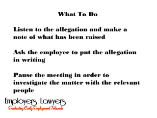 An employee raised a grievance during a disciplinary meeting. The employer should listen to the grievance, ask the employee to put it in writing, and pause the disciplinary meeting to investigate the matter. The employer must conclude the grievance process before continuing the disciplinary meeting and keep the employee informed at all stages. Additional resources on disciplinary and grievance procedures are available on the listed website.