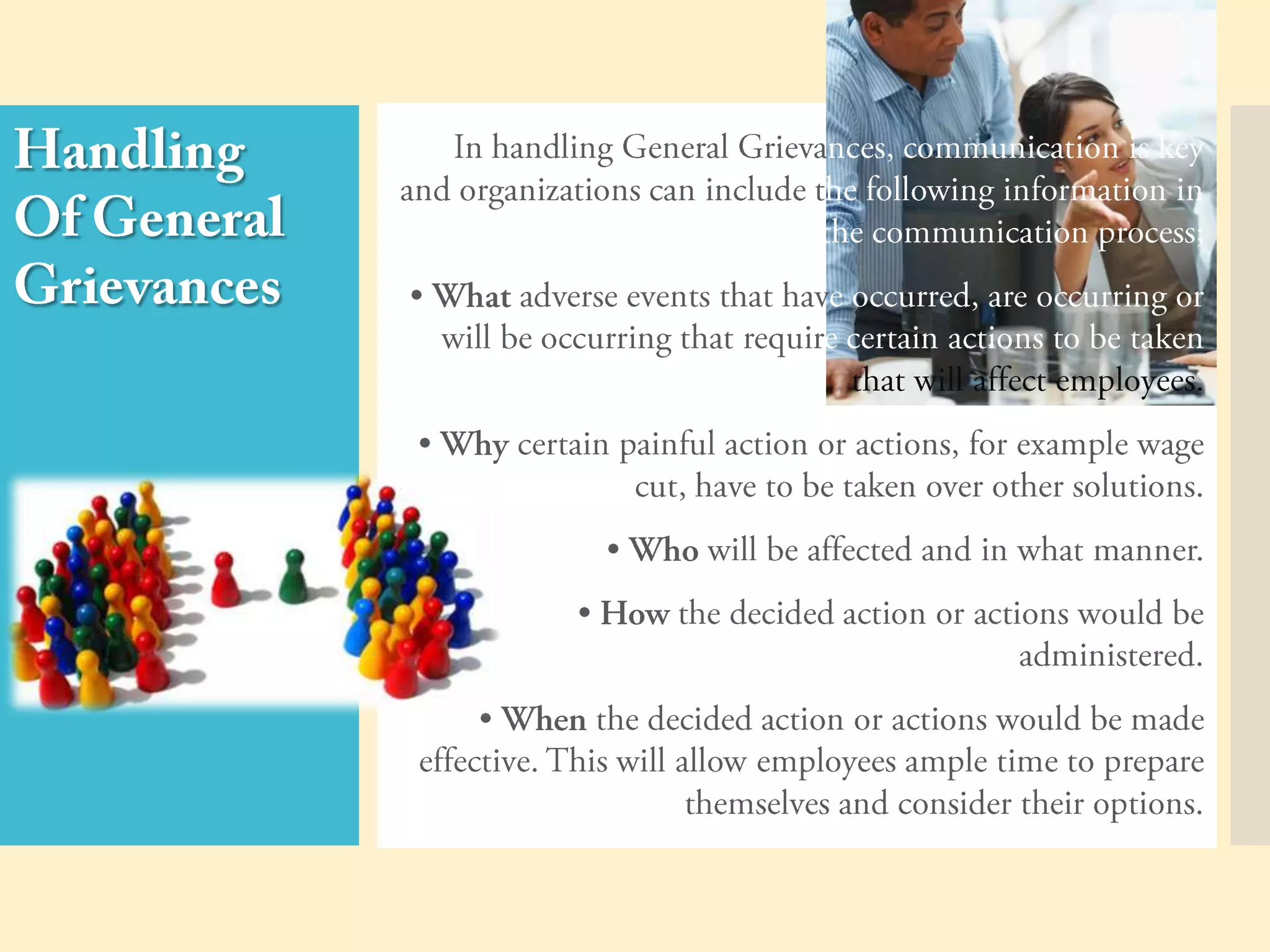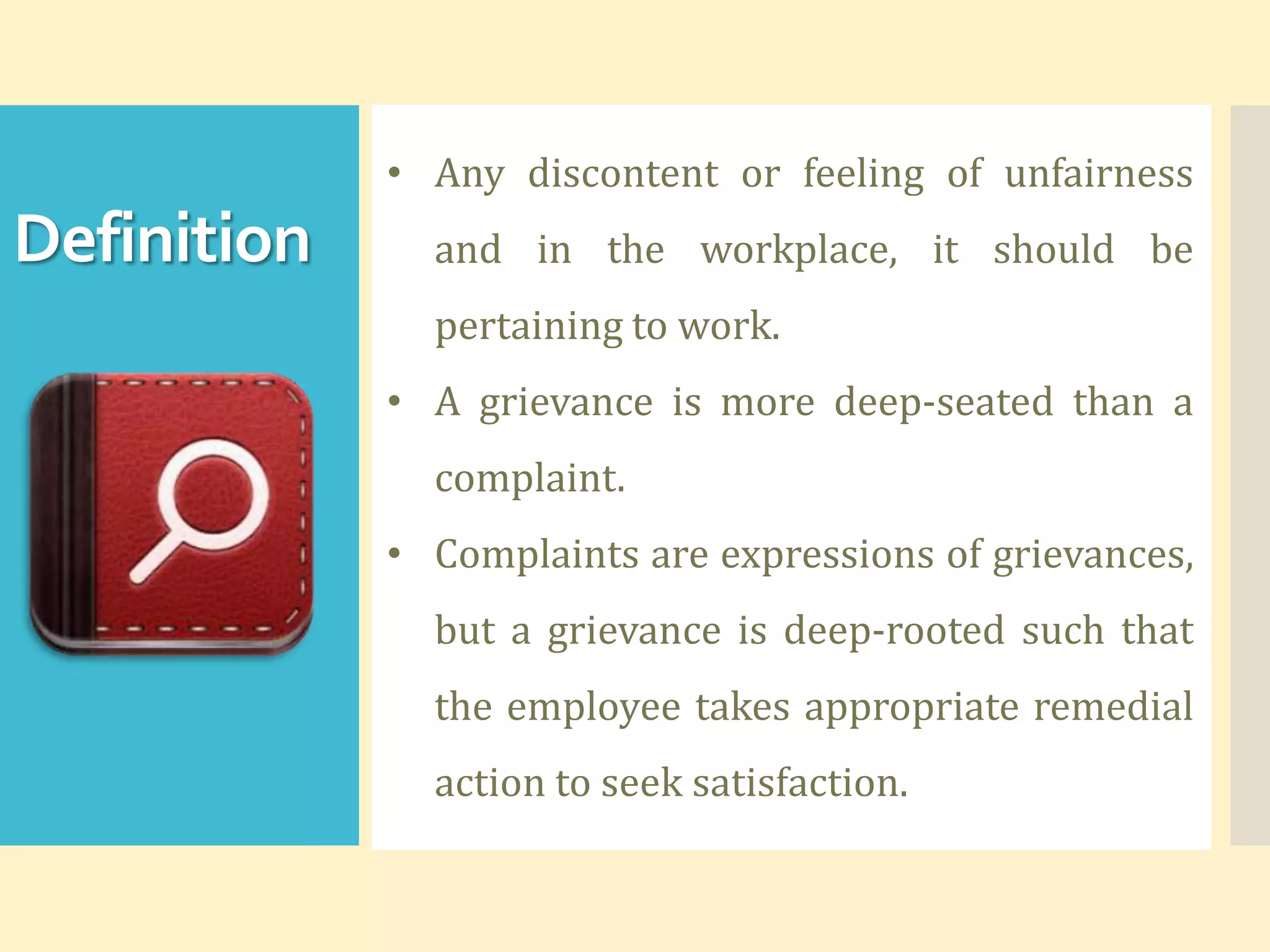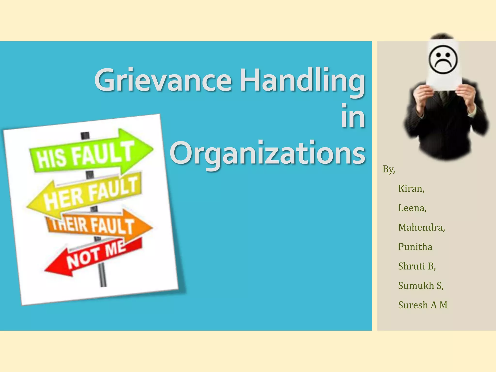 Grievance handling in organizations is defined as any discontent or feeling of unfairness pertaining to work. A grievance is more deep-seated than a complaint as it leads an employee to take action to seek satisfaction. Grievances can be due to factors like unfair treatment, lack of communication, unequal pay, and unhealthy work environment. Common types of grievances include disciplinary grievances, grievances related to work conditions, payment related grievances, and policy related grievances. Organizations need to have a reliable grievance redressal procedure to resolve issues promptly and maintain employee satisfaction.