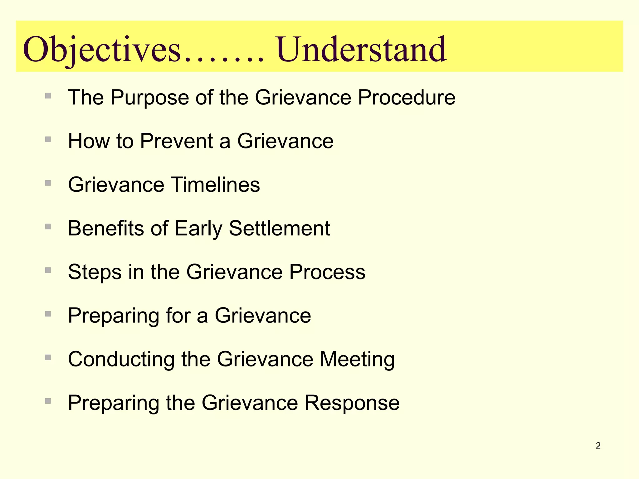 The document outlines the grievance process, including: