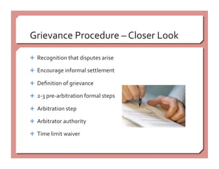 The document outlines the grievance procedure and timelines. It recognizes that disputes can arise and encourages informal resolution. There are typically 2-3 formal pre-arbitration steps followed by a potential arbitration step where an arbitrator makes a binding decision. The document provides examples to help track timelines, such as an alleged violation occurring on September 15th resulting in a filing deadline of October 5th, and a grievance being filed on October 4th requiring a meeting within 14 days by October 18th.