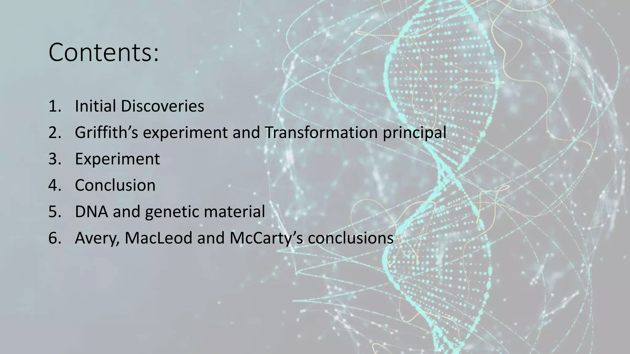 The document outlines key discoveries in identifying DNA as genetic material, starting with early experiments by Mendel and Griffith, who demonstrated the transformation of non-virulent bacteria to virulent forms. Griffith's experiments involved injecting mice with different strains of streptococcus pneumoniae, leading to the conclusion that a 'transforming principle' from heat-killed bacteria was responsible for this change. Subsequent work by Avery, MacLeod, and McCarty confirmed DNA as the genetic material, challenging earlier notions that proteins served this role.