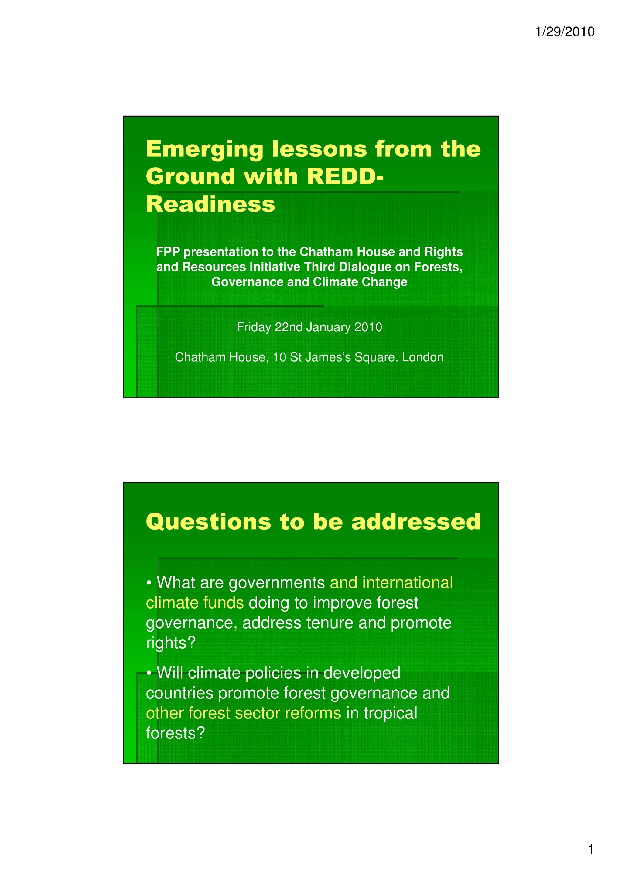 This document summarizes emerging lessons from efforts to implement REDD+ (Reduced Emissions from Deforestation and forest Degradation). It finds that (1) consultations with indigenous peoples and forest communities are often lacking or delayed, (2) free, prior and informed consent is not being properly implemented, and (3) plans do not sufficiently clarify land and carbon rights or respect traditional livelihoods. Key lessons are that rights-based approaches and safeguards need proper implementation mechanisms and oversight to be effective, and more resources are required to ensure meaningful participation and equitable benefits for local communities in REDD+ programs.