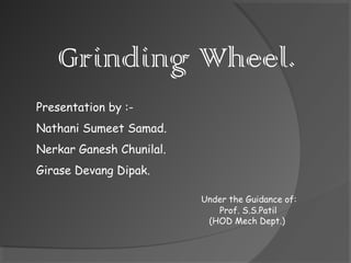 This document provides information about grinding wheels and grinding processes. It discusses the key components of grinding wheels including abrasives and bonds. It describes the basic functions of grinding wheels such as material removal and surface generation. It also covers wheel specifications, dressing, truing, balancing, selection criteria, and safety precautions for grinding operations.