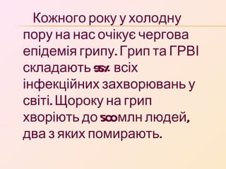Кожного року ухолодну пору на нас очікує чергова епідемія грипу. Грип та Г РВІ складають 95% всіх інфекційних захворювань у світі. Щороку на грип хворіють до 500 млн людей, два з яких помирають.