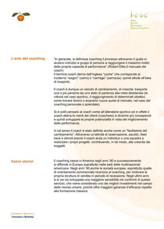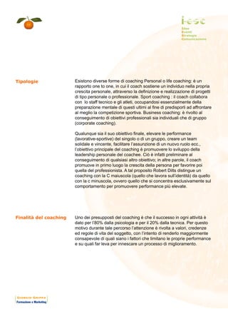 Il coaching è un processo che supporta individui e gruppi nel raggiungimento delle loro massime capacità di performance, fungendo da veicolo di cambiamento e crescita personale. Generatosi negli anni '80 in America e diffusosi in Europa, il coaching è ora riconosciuto come un efficace strumento di sviluppo delle risorse umane rispetto alla formazione tradizionale. Esistono diverse tipologie di coaching, tra cui il life coaching, lo sport coaching e il business coaching, tutte mirate a promuovere la crescita personale e professionale del coachee.