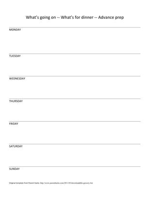 The document is a comprehensive grocery list organized by categories such as proteins, personal supplies, produce, paper goods, cleaning supplies, breakfast items, snacks, and other essentials. It includes various food items, cleaning products, and personal care necessities. Additionally, it features a meal planning section to aid in dinner preparation for the week.