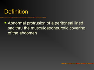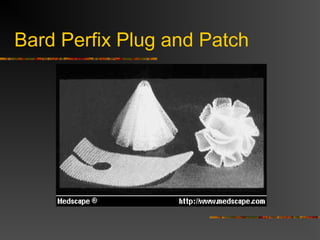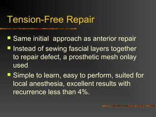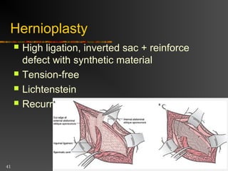 This document discusses groin hernias, including their definition, anatomy, types, and treatment methods. It notes that inguinal hernias are most common, occurring in 96% of cases, and are more frequent in males. The two main types are indirect hernias, which pass through the internal ring, and direct hernias, which occur through Hesselbach's triangle. Treatment has evolved from early cauterization and debridement to modern tension-free repairs using synthetic mesh, which have significantly lower recurrence rates than open suture repairs. Laparoscopic techniques are increasingly utilized but remain more complex and costly.