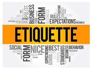 This document discusses professional grooming, etiquette, and dress codes. It provides tips for appropriate business attire including being well-groomed, dressed appropriately for your role and gender, and wearing clean and well-maintained clothing. Etiquette tips are given for phone, meeting, social, and business situations focusing on polite behaviors, introductions, listening, and using manners. Guidelines are outlined for both men's and women's professional dress and etiquette standards.