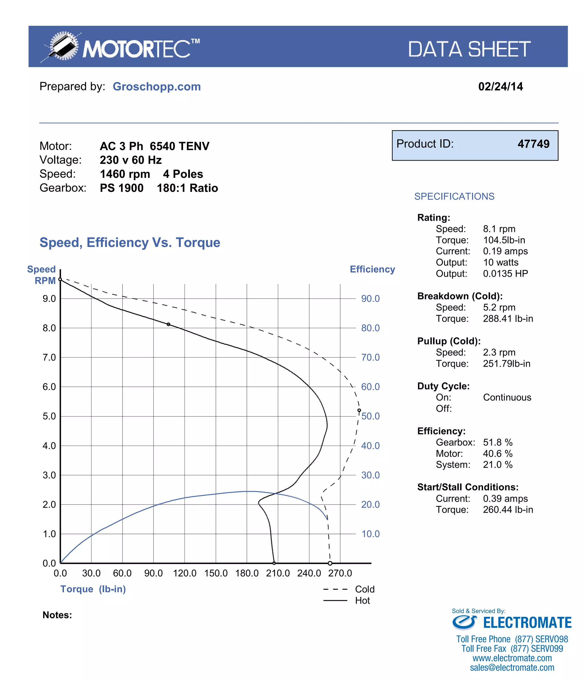 This document provides specifications for an AC 3 Phase 6540 TENV motor with a PS 1900 180:1 ratio gearbox. Key specifications include a voltage of 230V 60Hz, speed of 1460 rpm, output of 0.0135 HP at 8.1 rpm, and torque measurements for startup, operating, and breakdown conditions. Charts show efficiency curves for the gearbox, motor, and overall system at varying torque and speed levels.