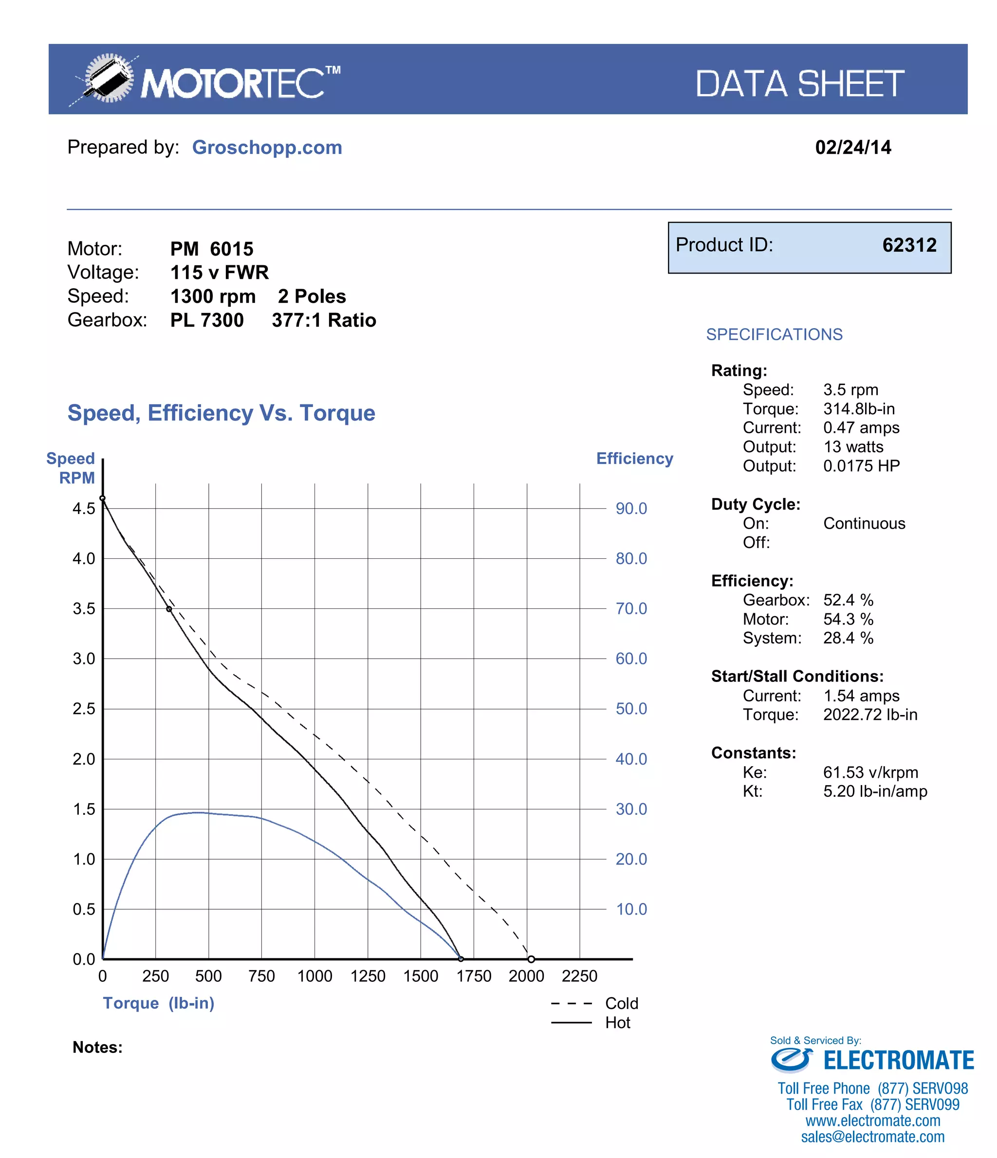 This document provides specifications for a PM 6015 motor with a PL 7300 377:1 ratio gearbox. The motor runs on 115V, has a speed of 1300 RPM, and outputs 3.5 RPM and 314.8 lb-in of torque at 0.47 amps and 13 watts or 0.0175 HP. The gearbox has an efficiency of 52.4% and the motor 54.3% for a total system efficiency of 28.4%. Start conditions require 1.54 amps and 2022.72 lb-in of torque. A graph shows efficiency between 10-90% as torque varies from 0-4.5 lb-in and speed from 0-2250 RPM.