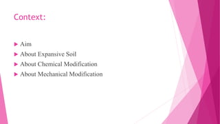 The document discusses various ground improvement techniques targeting expansive soils that expand when wet and shrink when dried, posing challenges for construction. It covers methods such as mechanical modification through compaction, chemical modification via grouting, and foundation techniques like under-reamed piles to enhance soil stability and load-bearing capacity. Additionally, it outlines the properties of expansive soils, their challenges, and types of compaction equipment suitable for different soil conditions.