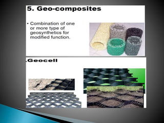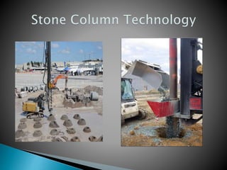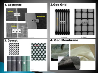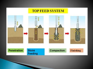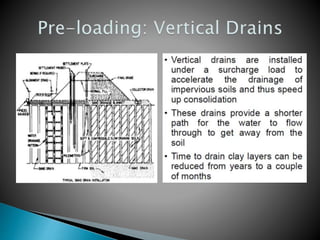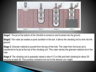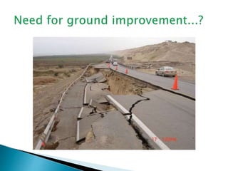 The document discusses various ground improvement techniques used to modify the engineering properties of soils, including densification, consolidation, reinforcement, and chemical treatment. It provides details on specific techniques like vibroflotation, ground freezing, and soil nailing. Geosynthetics are also introduced as natural or artificial products used in geotechnical constructions to improve properties of soils.
