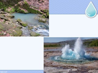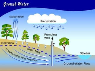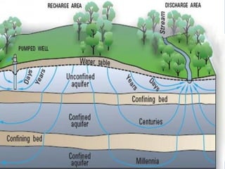 This document defines groundwater as water present beneath the Earth's surface, within soil pores and fractures in rock formations. An aquifer is a unit of rock or sediment that yields usable water. The water table marks the depth where pores and fractures become fully saturated. Groundwater is extracted via wells for agriculture, municipal, and industrial uses. Its study is called hydrogeology. Springs form when aquifers fill to the point of overflowing onto land. Pumping a well creates a cone of depression in the water table or pressure levels around the well. The size of this cone depends on factors like the pumping rate, aquifer properties, storage, and thickness.
