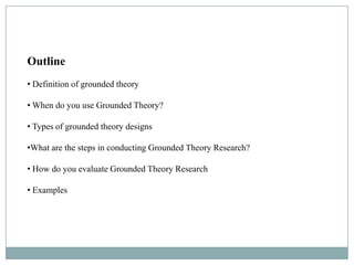 This document provides an overview of grounded theory designs in qualitative analysis. It defines grounded theory as a systematic qualitative method for generating theory from data. Grounded theory was developed in the 1960s by sociologists Glaser and Strauss and involves collecting and analyzing data to build theories through identifying patterns and relationships. The document discusses the key aspects of grounded theory including when to use it, types of designs, conducting research using the approach, and evaluating grounded theory studies. It provides examples and references key sources on grounded theory.