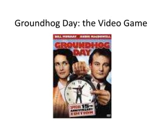This document proposes a video game based on the movie Groundhog Day. In the game, the player's character is trapped in a time loop where they repeatedly wake up and live the same day over and over. As the player progresses through each repeated day, they learn more about the game world and how to interact with and affect other characters. The goal is to utilize this growing knowledge and awareness to ultimately help others and "win" the game. Gameplay is focused on social interactions and personal growth rather than traditional action/adventure mechanics.