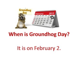 Groundhogs are small, furry animals found in parts of North America. According to folklore, if a groundhog sees its shadow on Groundhog Day, February 2nd, there will be six more weeks of winter weather; if no shadow is seen, spring will come early. Each year in Punxsutawney, Pennsylvania, a groundhog predicts the weather on Groundhog Day in a ceremony overseen by the Groundhog Club's Inner Circle group dressed in top hats.