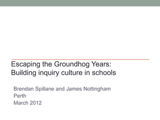 The document discusses building an inquiry culture in schools. It begins by outlining the hopes and goals of resolving issues, establishing routines, and reconnecting colleagues. It then discusses different levels of skill acquisition using the Dreyfus model, from novice to expert. Key questions are posed about thinking, routines, groupthink, and defining terms like ordinary and extraordinary. Trust is examined as organic, contractual, and relational. A continuum of organizational maturity is presented. Examples of Socratic quotes are provided, and an "ethos for learning" is described that questions all answers. The power of real questions and positional dynamics in conversations are explored. A look at team culture pillars of empathy, engagement, clarity of purpose and learning is taken