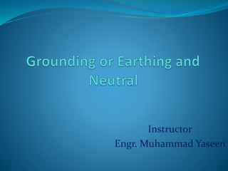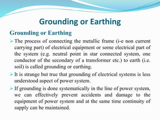 The document discusses different types of grounding or earthing systems for electrical equipment and power systems. It defines equipment grounding as connecting the non-current carrying metal parts of electrical devices to earth for safety. System grounding involves earthing parts of the electrical distribution system, such as the neutral point of a star-connected system. Neutral grounding, a type of system grounding, protects equipment and personnel by connecting the neutral point to earth and allowing fault currents to trip circuit breakers. Common methods of neutral grounding include solid grounding, resistance grounding, and reactance grounding.