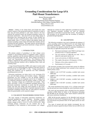 This document analyzes grounding considerations for large kVA pad-mount transformers. It summarizes the assumptions made in analyzing different transformer voltages and kVA sizes up to 5,000 kVA. Calculations of ground potential rise, touch potential and step potential are performed and compared to safety limits. Results show the standard two ground rod system may not provide adequate protection for transformers over 750 kVA or higher secondary voltages. Larger or engineered grounding systems are recommended for safety.